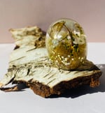 Denne ring er nøje håndlavet i bæredygtig 50% bioresin. Indlejret i den klare bioresin finder du tørret rhododendron og guldglimmer.