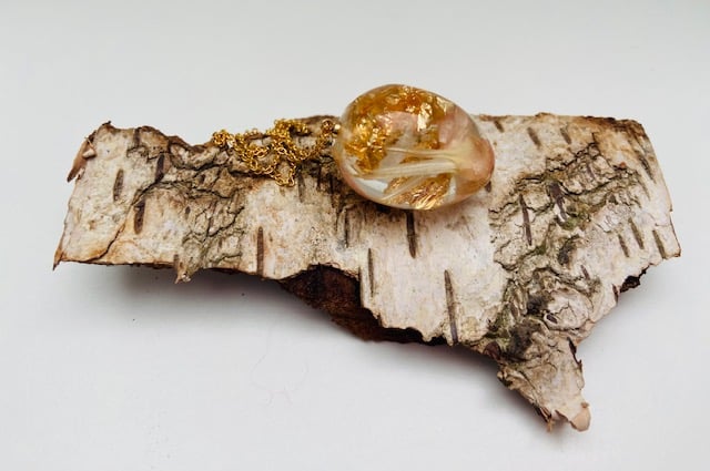 Dette vedhæng er nøje håndlavet i bæredygtig 50% bioresin. Indlejret i den klare bioresin finder du 24 karat bladguld, lyserøde nellikeblade og glimmer. Kæden er cirka 60 centimeter lang. Den er forgyldt med 18 karat guld.
