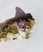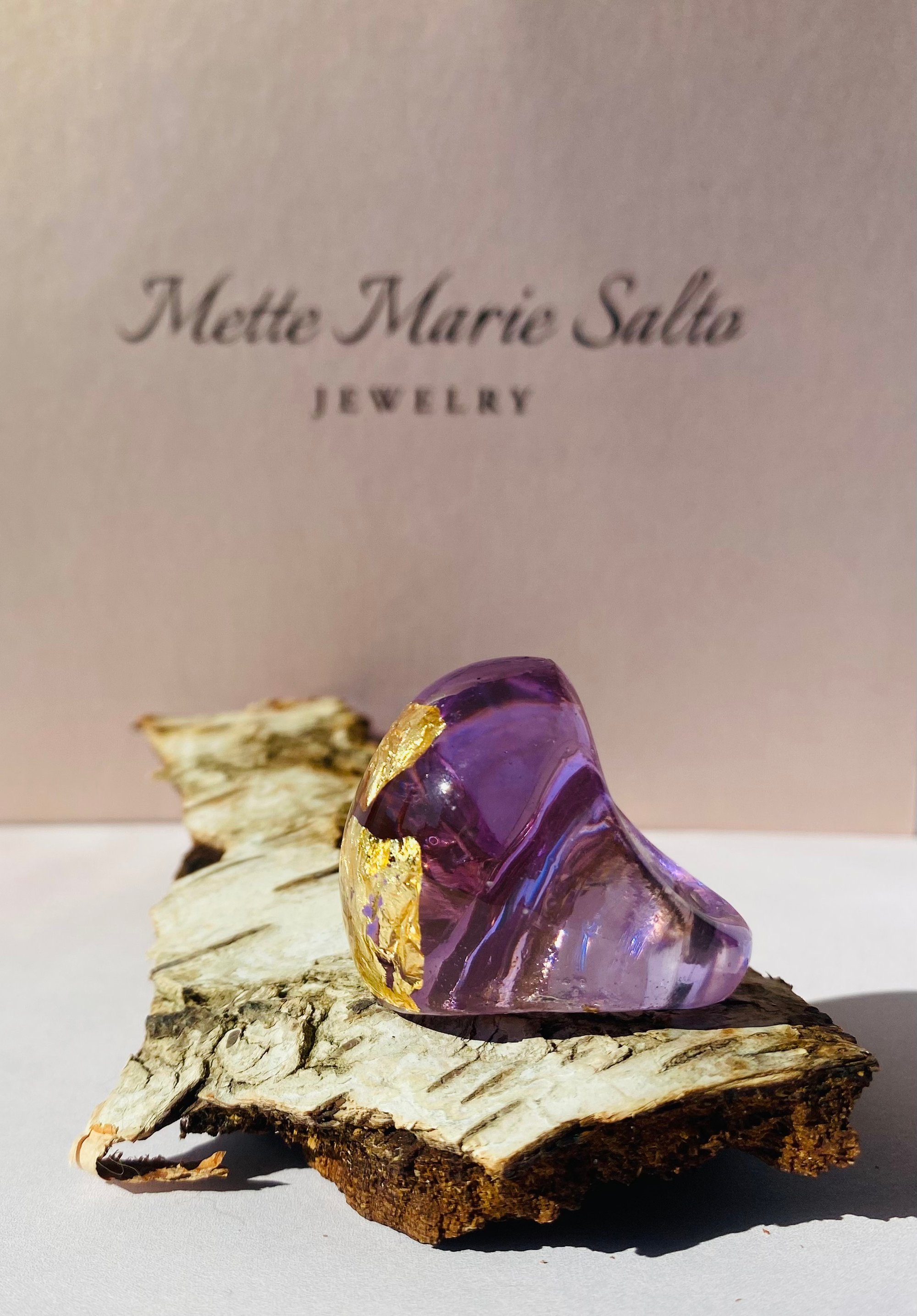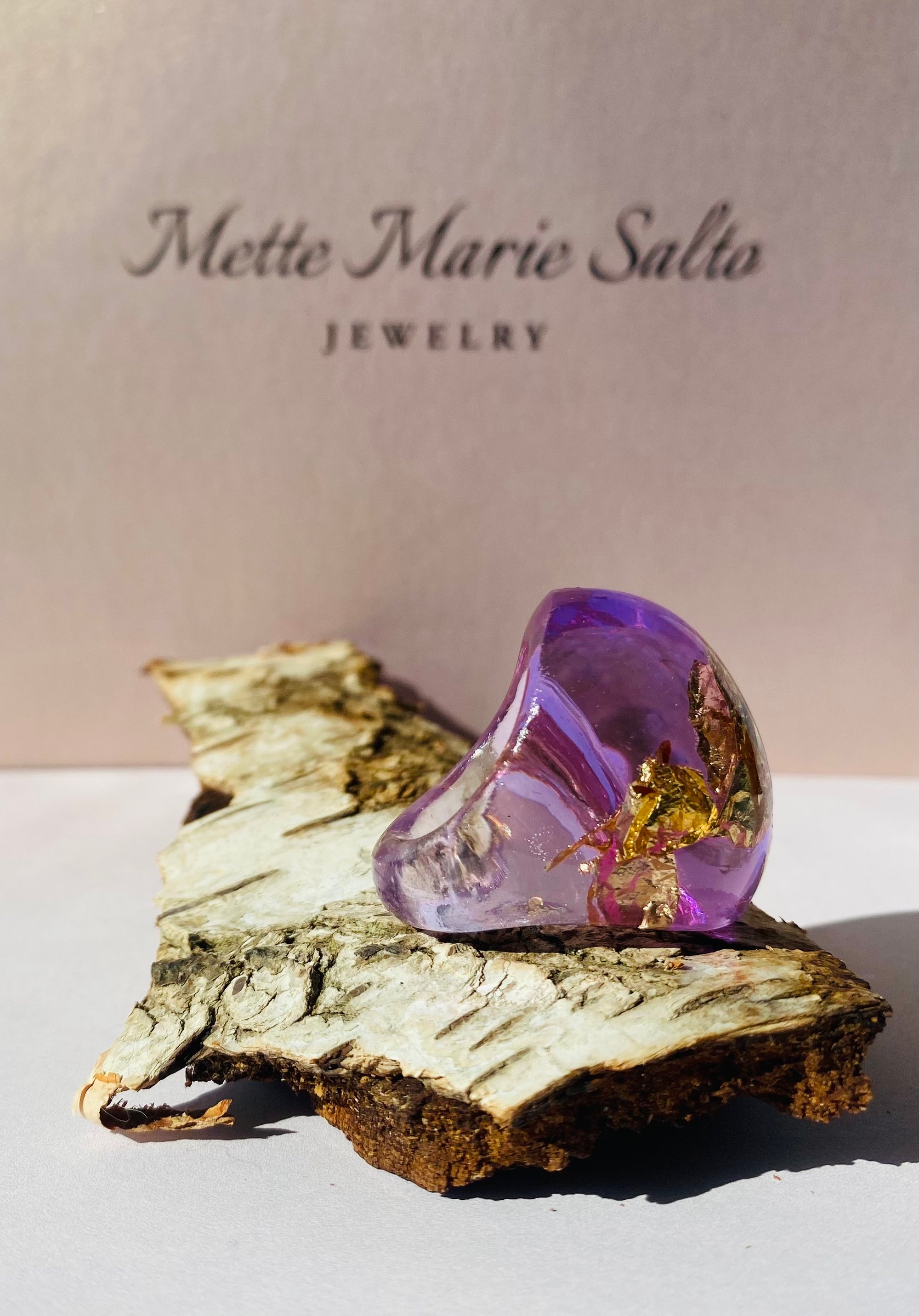Denne ring er nøje håndlavet i bæredygtig 50% bioresin. Indlejret i den klare bioresin finder du 24 carat bladguld og ringen er indfarvet i en smuk lilla farve.