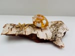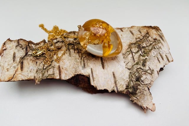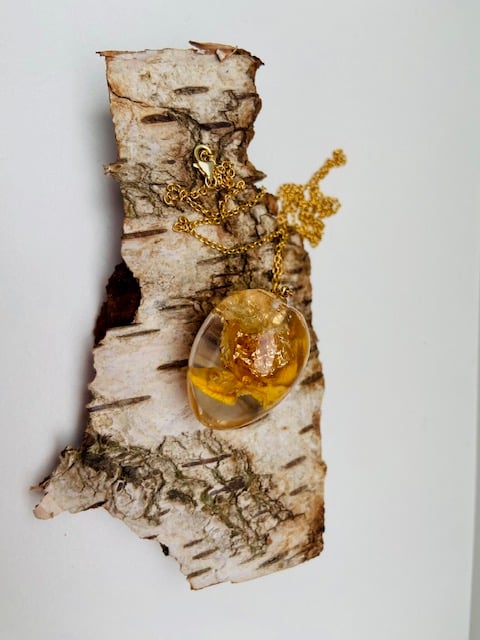På billedet ser du en halskæde hvor der er indkapslet tørrede rosenblade i rosinen, samt guldglimmer.
