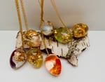 Dette vedhæng er nøje håndlavet i bæredygtig 50% bioresin. Indlejret i den klare bioresin finder du 24 karat bladguld, blade fra orange fløjelsblomst, fjer og glimmer. Kæden er cirka 60 centimeter lang. Den er forgyldt med 18 karat guld.